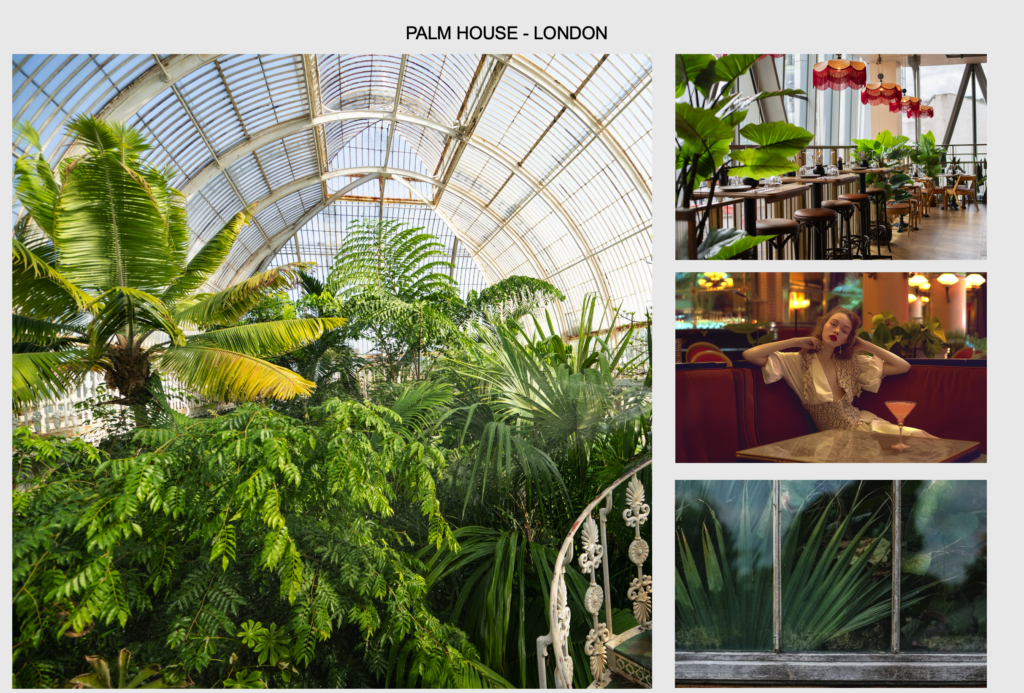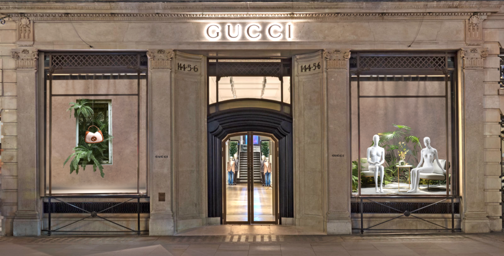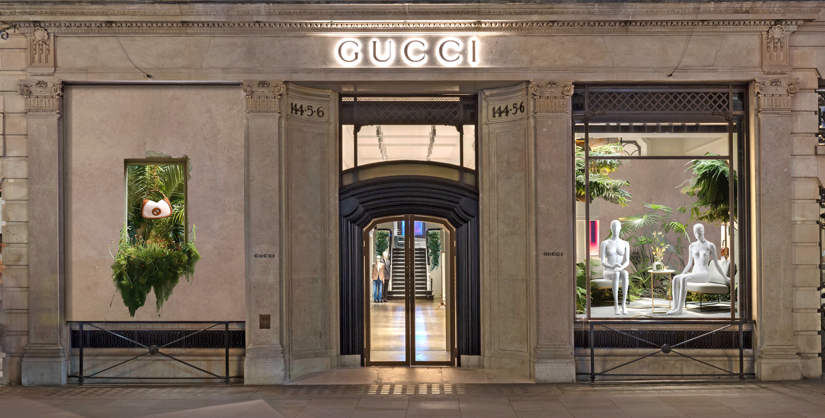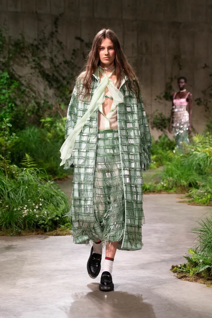 The set-up of Gucci’s Cruise 2025 showcase takes inspiration from the duality of nature and urban architecture, interpreted through the concept of the city vacation. Set on New Bond Street in London, a city famous for its vast parks, the set-up blends the exotic with the metropolitan, drawing inspiration from the Royal Botanic Garden: a “greenhouse” nestled in the heart of the city, filled with tropical species