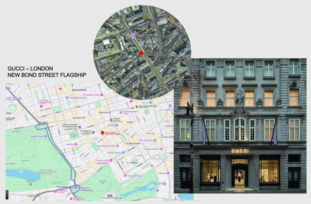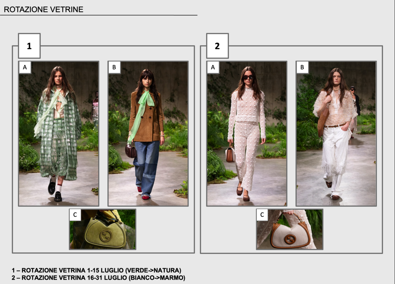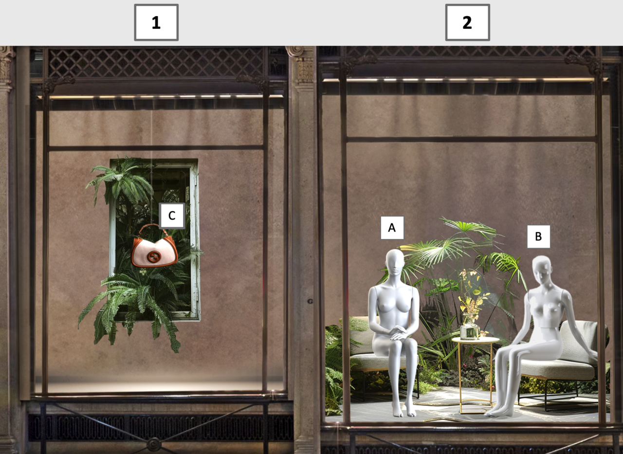 The set-up of Gucci’s Cruise 2025 showcase takes inspiration from the duality of nature and urban architecture, interpreted through the concept of the city vacation. Set on New Bond Street in London, a city famous for its vast parks, the set-up blends the exotic with the metropolitan, drawing inspiration from the Royal Botanic Garden: a “greenhouse” nestled in the heart of the city, filled with tropical species